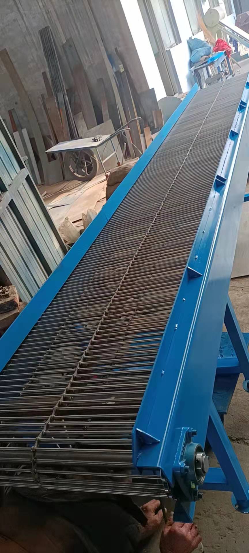 給淄博 山東超越輕工制品有限公司定做的玻璃瓶降溫傳送帶輸送機完工今天發(fā)貨 鏈桿片輸送機 長度5米 有效寬度720毫米 高度800毫米 從地面到鏈桿輸送帶上平面是800毫米 可調(diào)節(jié)的高度再700-800毫米之間 實際調(diào)節(jié)距離100毫米 節(jié)距25.4毫米 支軸直徑8毫米 在輸送帶中間加一趟鏈條片