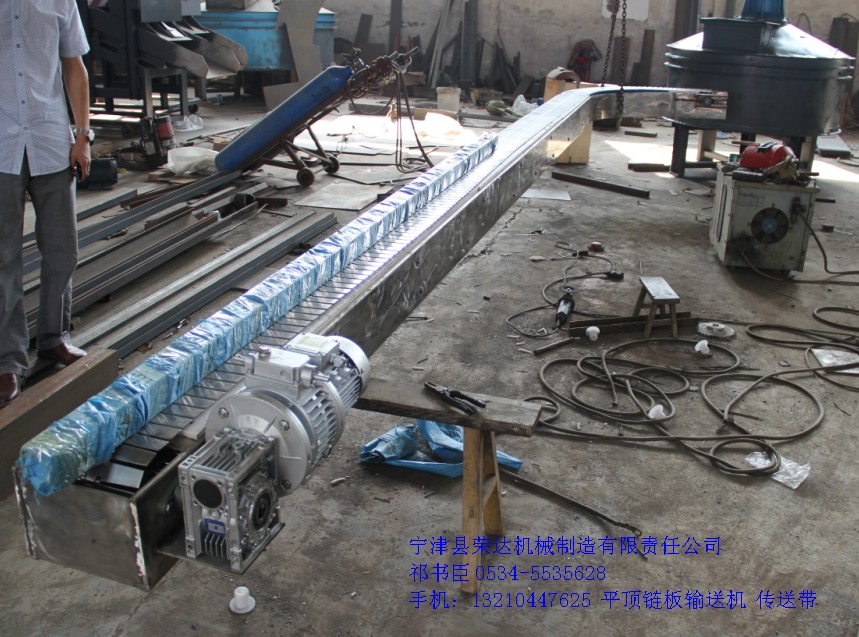 2015年08月四川食品廠跟我們公司聯(lián)系,詢問是否能夠定做拐彎90度的水桶輸送機(jī),我們根據(jù)他的要求設(shè)計了一款,拐彎90度的平頂鏈板輸送機(jī),材質(zhì)不銹鋼的,輸送機(jī)的長度直輸?shù)牡胤?米,拐彎90度,總長度7米,采用190.5毫米的平頂鏈板,輸送機(jī)外寬260毫米,輸送機(jī)的高度200毫米,500斤