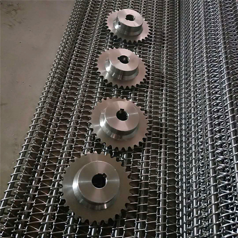 給江西客戶定做的鏈條式網(wǎng)帶,材質(zhì)304,還有配套的鏈輪。鏈條節(jié)距:9.525 鏈條中心距850