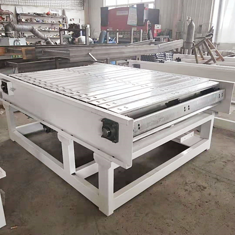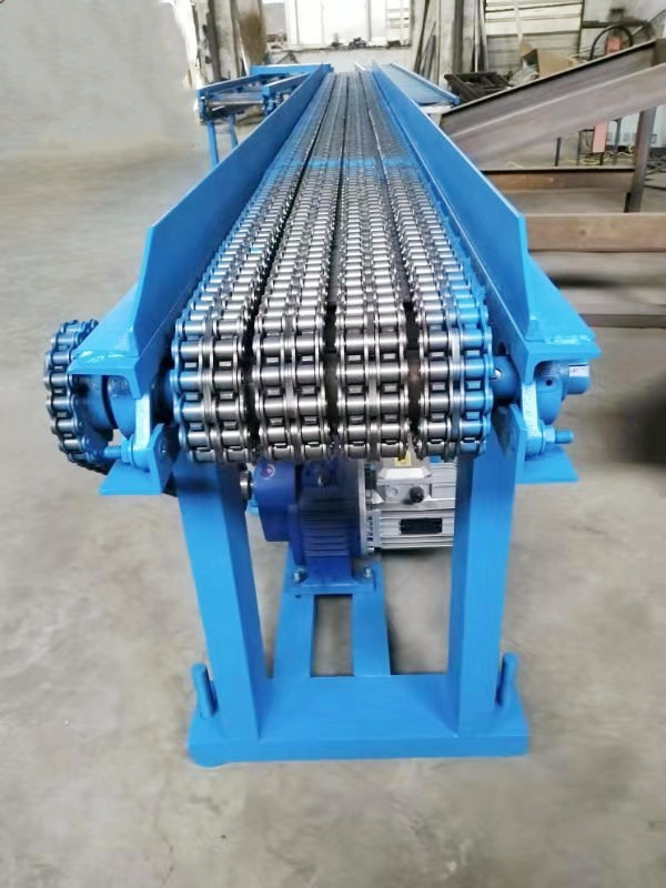 (5)槽鋼扣板輸送機(jī)。采用8個(gè)國(guó)標(biāo)槽鋼制作。輸送大型笨重的鍛造件,平穩(wěn)。使用壽命長(zhǎng)。抗砸,抗沖擊力。槽鋼扣板輸送機(jī)多數(shù)用來(lái)輸送大鍛造件。