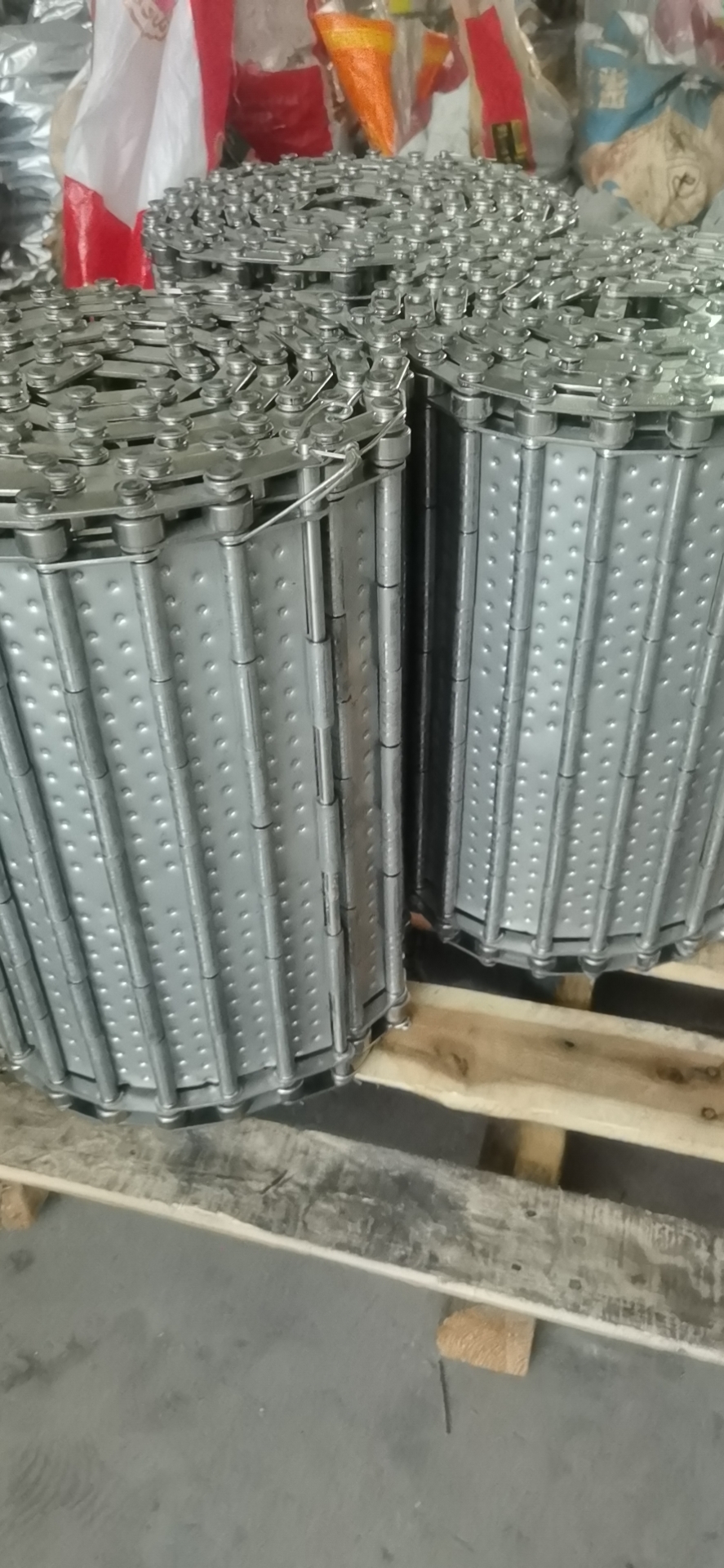 給客戶定做的輸送帶, 有效寬度800毫米 板厚1.0毫米 鏈條50.8毫米 支軸8毫米 橫擋板側(cè)擋板有效高度60毫米 橫擋板間距100毫米 。