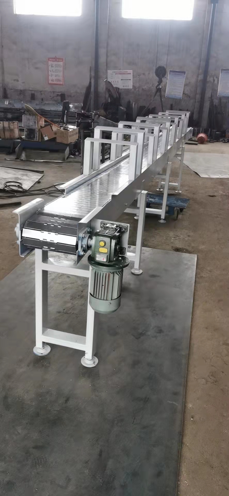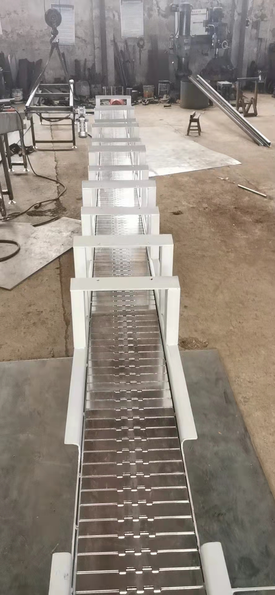 鍛造件鏈板輸送機是直接輸送高溫鍛造件的,其輸送帶必須能不怕熱,不變形,還耐高溫很強才可以承載鍛造件。我們采用的是耐熱的不銹鋼鏈板輸送帶。根據寬度不同,有平頂鏈鏈板輸送帶,合頁鏈板輸送帶和槽鋼鏈板輸送帶。已標準的頂板鏈或合頁鏈板輸送帶為承載面,以馬達減速機做動力傳動。
