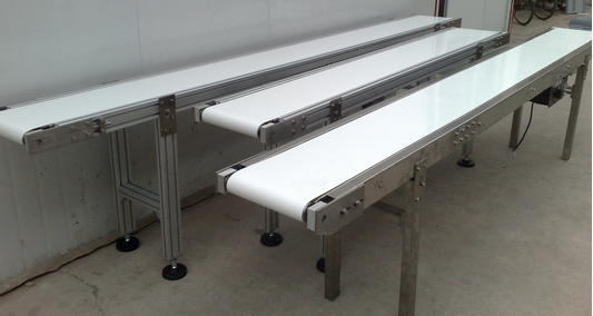 輕型皮帶輸送機(jī)主要由不銹鋼材料的機(jī)架,不銹鋼的可調(diào)支腳、驅(qū)動(dòng)架、電機(jī)、驅(qū)動(dòng)滾筒、改向滾筒、張緊滾筒、張緊裝置、調(diào)偏裝置、防護(hù)罩等組成。