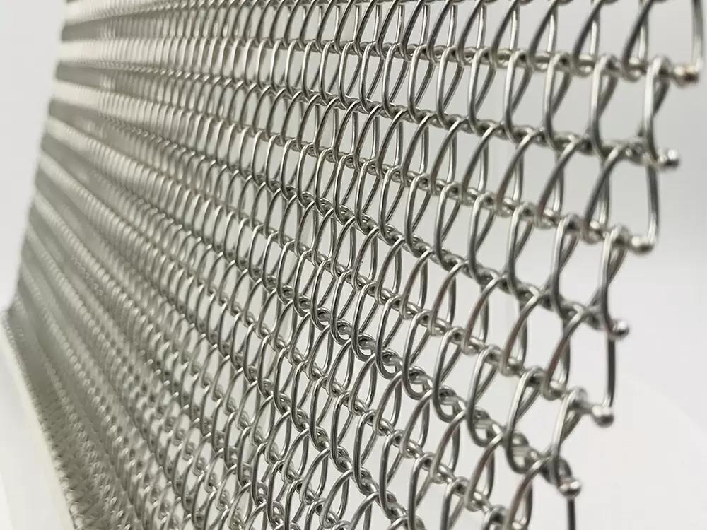 雙旋網(wǎng)是使用曲軸或者直軸把右旋和左旋繞絲串起來形成平衡編織。左旋和右旋可以依據(jù)應(yīng)用使用圓絲或者扁絲加工生產(chǎn), 雙旋網(wǎng)一般采用摩擦驅(qū)動(dòng), 也可以定制齒輪配合網(wǎng)帶驅(qū)動(dòng)。依據(jù)應(yīng)用環(huán)境,選擇合適的螺距和節(jié)距,網(wǎng)帶邊緣一般有焊接或者折彎。