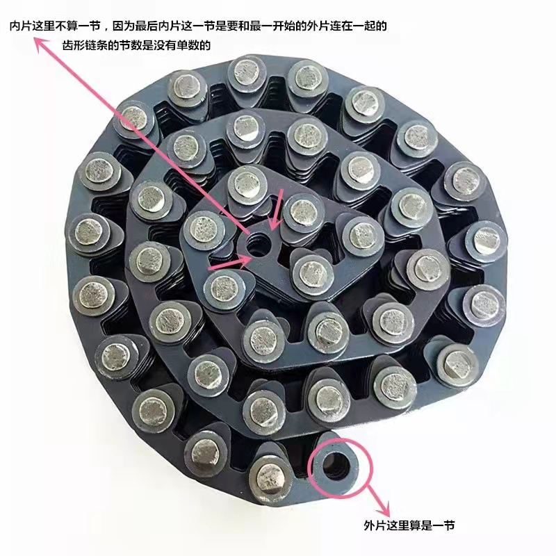 加鏈片排數(shù))。齒形鏈?zhǔn)且环N應(yīng)用廣泛的重要機(jī)械基礎(chǔ)件,主要用在高速、重載、低噪音、大中心距的工況下,其傳動(dòng)性能優(yōu)于齒形帶傳動(dòng)、齒輪傳動(dòng)以及滾子傳動(dòng),以成為眾多行業(yè)對(duì)傳動(dòng)形式之一,以嚙合形式分可分為內(nèi)嚙合齒形鏈、外嚙合齒形鏈和內(nèi)外復(fù)合嚙合齒形鏈,其中內(nèi)外復(fù)合嚙合齒形鏈的噪音最小,應(yīng)用也最廣泛