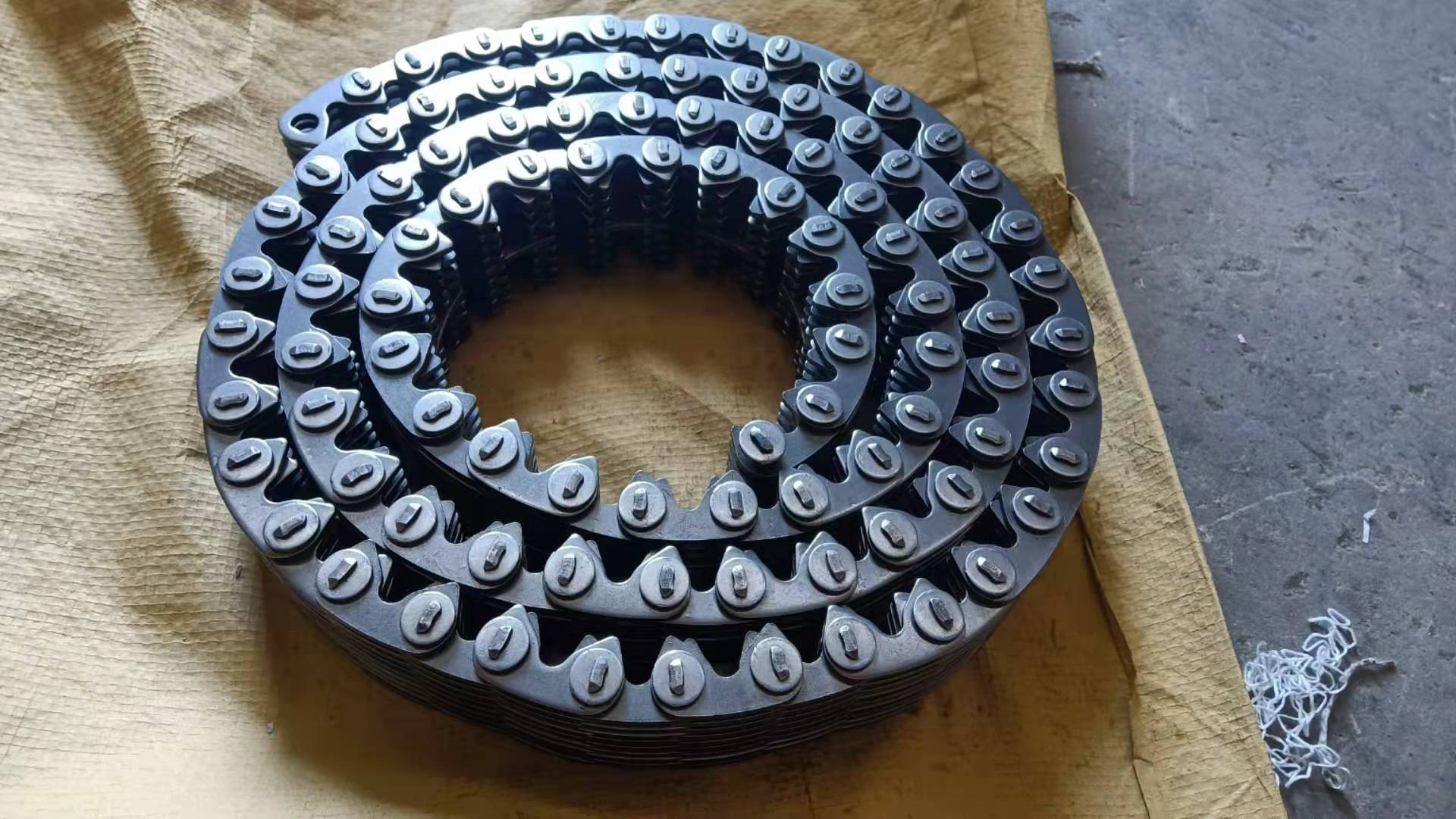 無聲鏈 齒形鏈輪  無聲鏈:也叫齒形鏈條,采用無聲齒形鏈輪帶動運(yùn)轉(zhuǎn)傳動。寧津縣榮達(dá)機(jī)械制造有限責(zé)任公司定做各種無聲齒形鏈條,無聲齒形鏈輪。我們根據(jù)客戶自己的情況,客戶選型成功,我們根據(jù)客戶的數(shù)據(jù)非標(biāo)定做各種齒形鏈條和無聲齒形鏈輪。齒形鏈條節(jié)距4.7625,6.35  9.525  12.7  15.875  19.05  25.4  31.75  38.1毫米的鏈條都能做,無聲齒形鏈輪根據(jù)客戶的齒數(shù)和外徑,內(nèi)孔,鍵槽定做。無聲齒形鏈條的獨(dú)特優(yōu)點(diǎn):高速,無噪音,高承載傳動能力,轉(zhuǎn)矩大等等優(yōu)點(diǎn),逐漸取代精密滾子鏈條和同步帶。