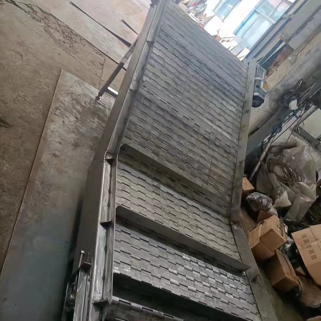 采用鏈板輸送機(jī) ,鏈條網(wǎng)帶輸送機(jī)放在水槽里面用來把水槽里面的產(chǎn)品提升出來