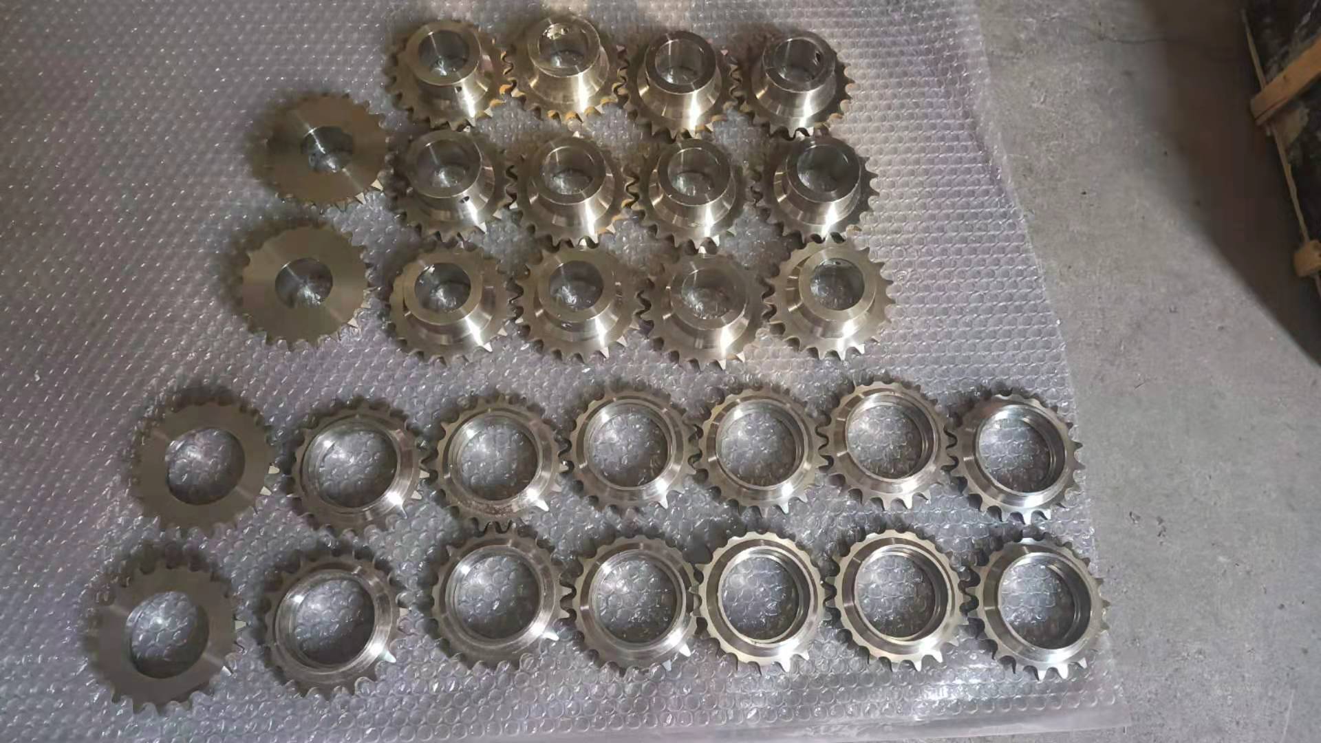 鏈輪軸面齒形兩側(cè)呈圓弧狀,以便于鏈節(jié)進(jìn)入和退出嚙合。齒形用標(biāo)準(zhǔn)刀具加工時(shí),在鏈輪工作圖上不必繪制端面齒形,但須繪出鏈輪軸面齒形,以便車削鏈輪毛壞。軸面齒形的具體尺寸見有關(guān)設(shè)計(jì)手冊(cè)。鏈輪齒應(yīng)有足夠的接觸強(qiáng)度和耐磨性,故齒面多經(jīng)熱處理。小鏈輪的嚙合次數(shù)比大鏈輪多,所受沖擊力也大,故所用材料一般應(yīng)優(yōu)于大鏈輪。常用的鏈輪材料有碳素鋼(如Q235、Q275、45、ZG310-570等)、灰鑄鐵(如HT200)等。重要的鏈輪可采用合金鋼。小直徑鏈輪可制成實(shí)心式;中等直徑的鏈輪可制成孔板式;直徑較大的鏈輪可設(shè)計(jì)成組合式,若輪齒因磨損而失效,可更換齒圈。